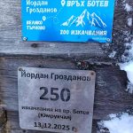 Известният великотърновски пътешественик и планински водач Йордан Грозданов изкачи за юбилеен 250-и път връх Ботев. Това е пореден подобрен рекорд на самия Грозданов, който няма аналог след хилядите българи, изкачвали най-високия връх на Стара планина.