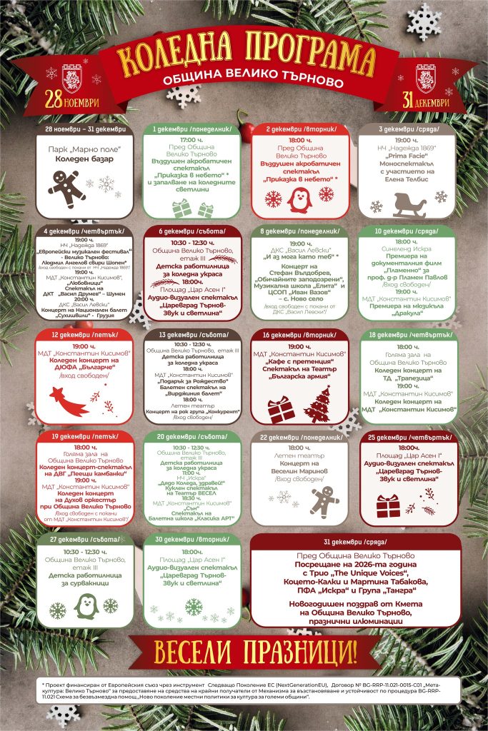 С богата програма Община Велико Търново ще зарадва жителите и гостите на града през празничния декември. Целият месец ще е изпълнен с концерти, културни събития, спектакли, атракции за малки и големи, детски работилници и празнични изненади, които ще се проведат в периода от 1 до 31 декември.